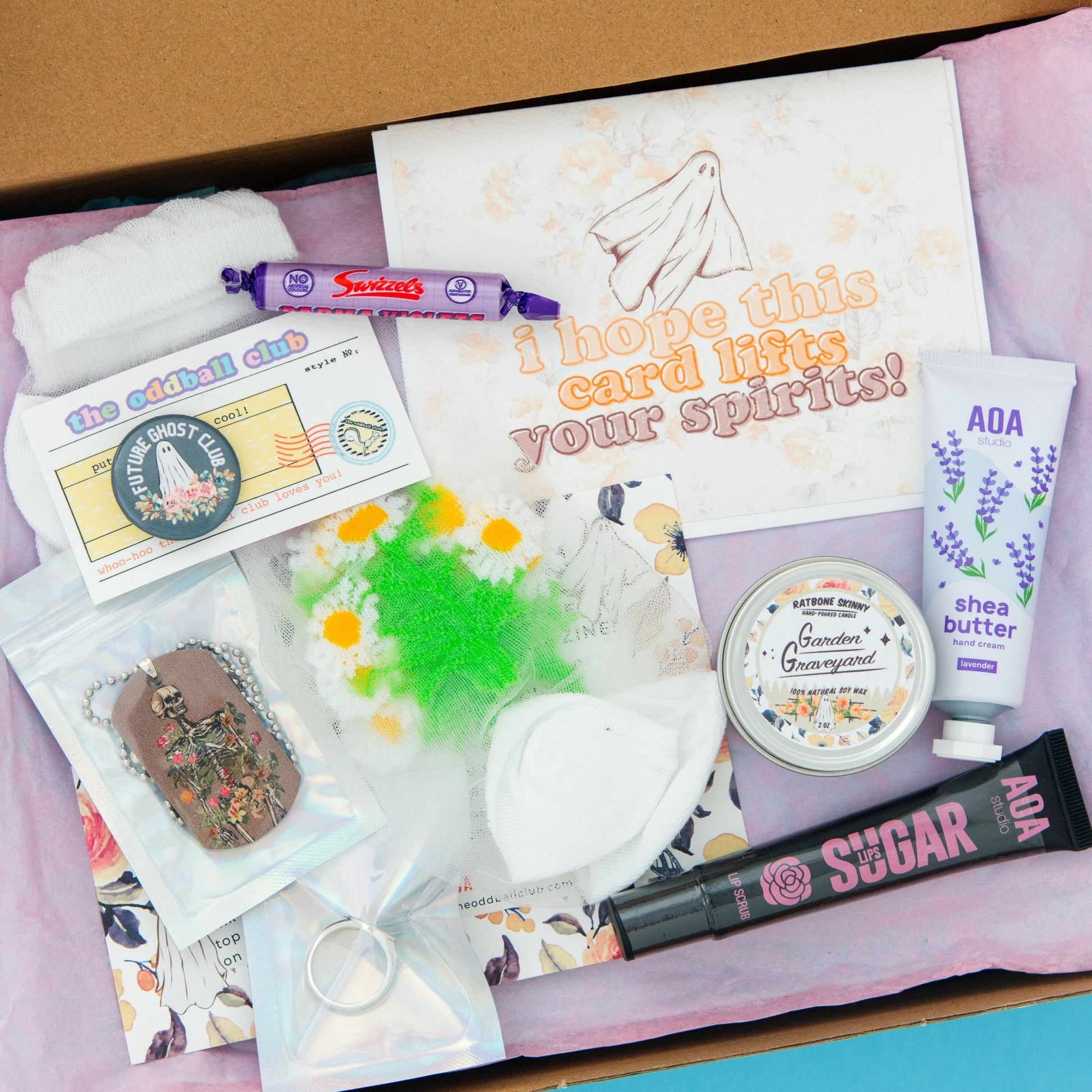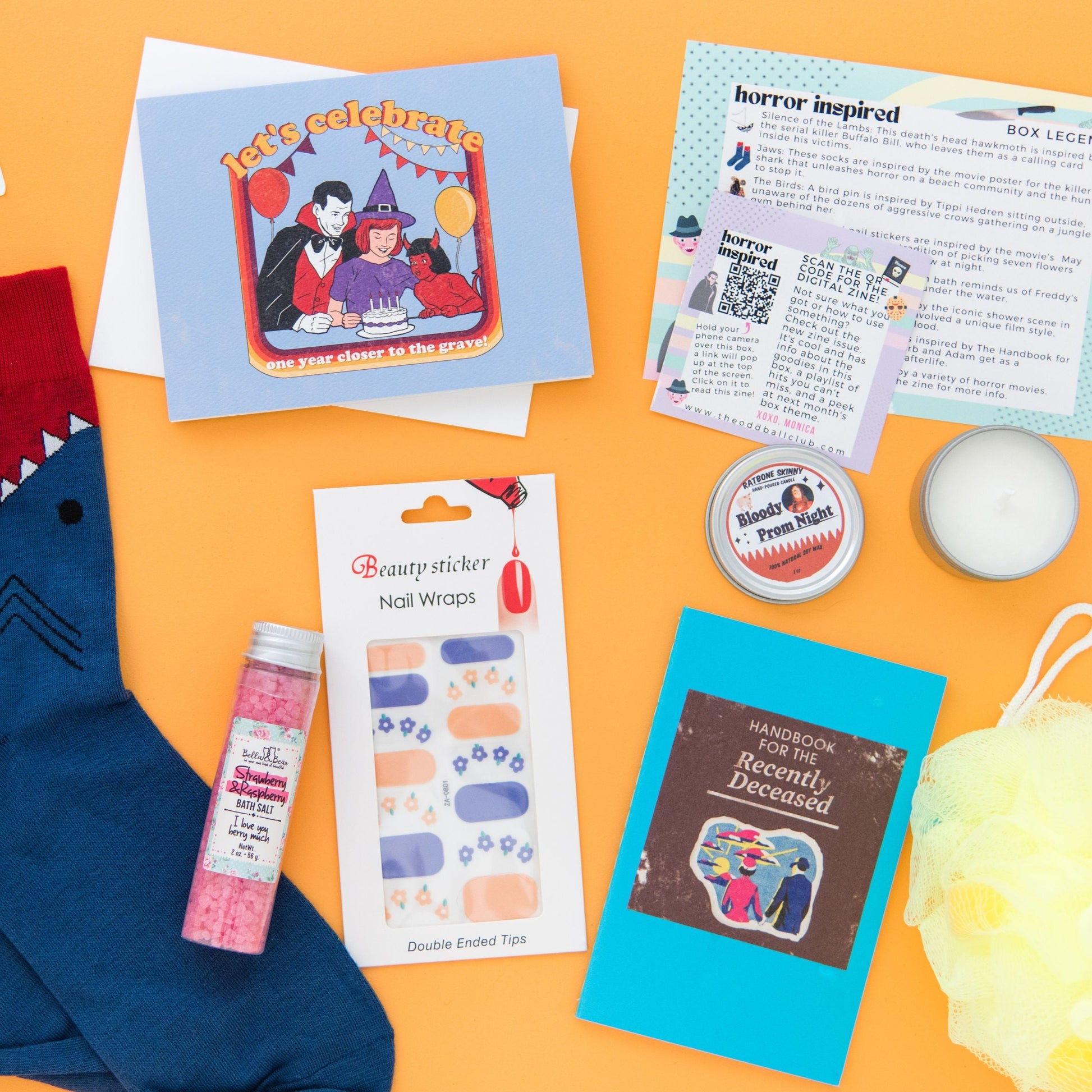 The Oddball Club is a monthly subscription box from Ratbone Skinny, featuring unique, fun, and nostalgic items like stickers, enamel pins, greeting cards, etc. Each month has a different theme, and the boxes come in two sizes.