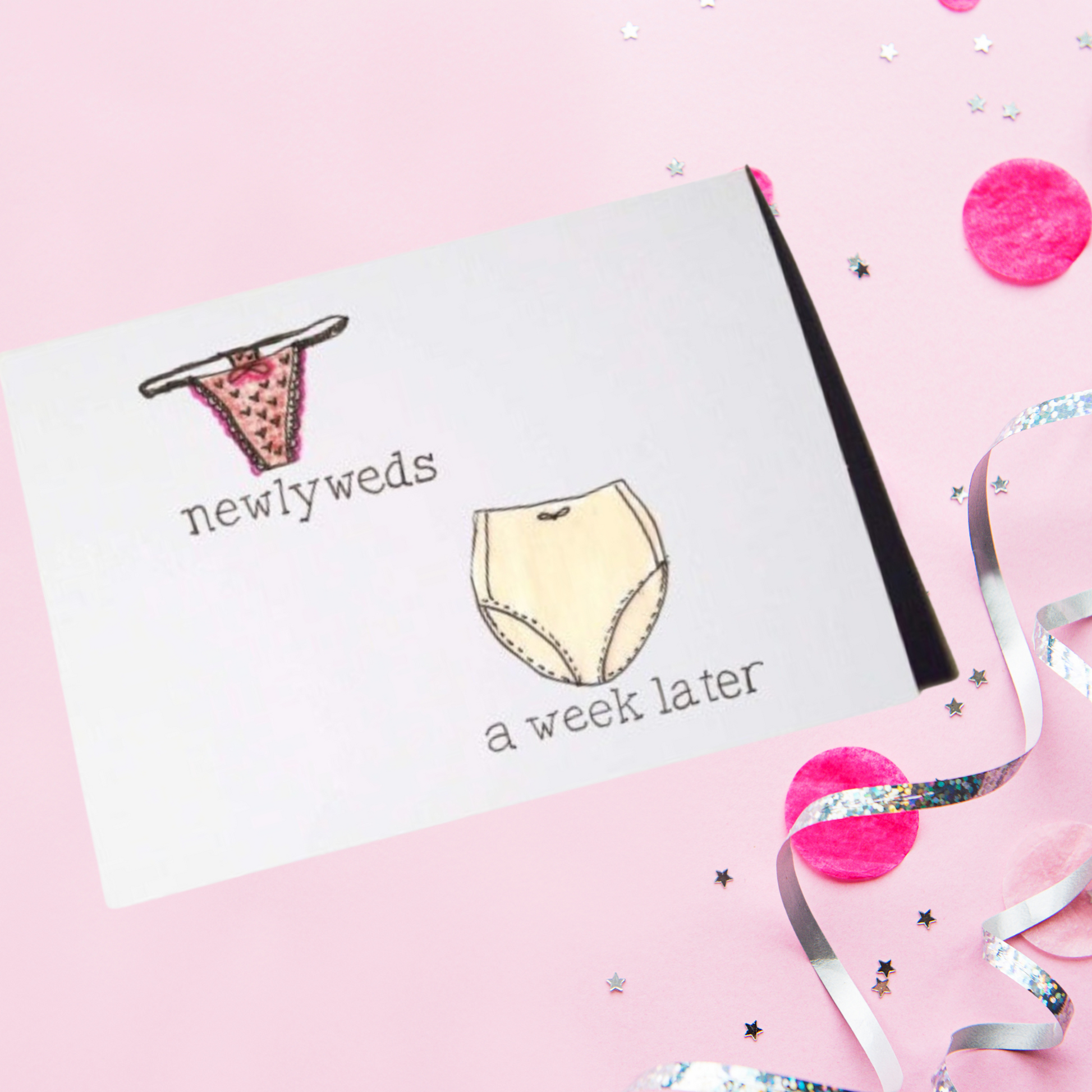 This funny Bachelorette Greeting Card is the perfect way to add a touch of humor to the pre-wedding celebrations. This A2 size card features a fun and cheeky design, with fancy underwear that says "Just Married" below and casual underwear that humorously state "A Week Later." The inside of the card is left blank for a personal message. Each card comes complete with a brown envelope for a stylish presentation. It's a great choice for letting your girlfriend in on the post-wedding truth in a light-hearted way. Make her smile with this playful and memorable card!