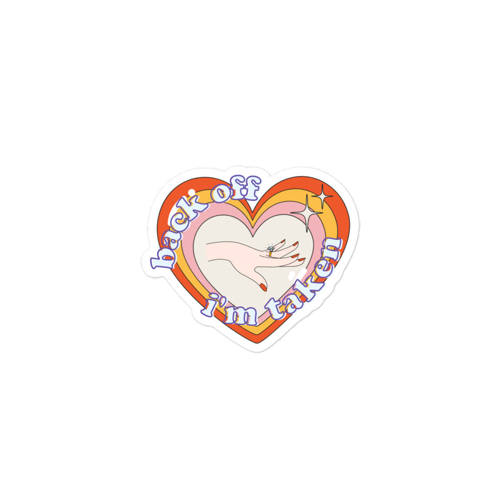 Celebrate your love with our "I'm Taken" engagement sticker! Featuring a sparkling ring and a charming hand, this sticker proudly announces your commitment. Stick it anywhere to share your joy and let the world know you're off the market!