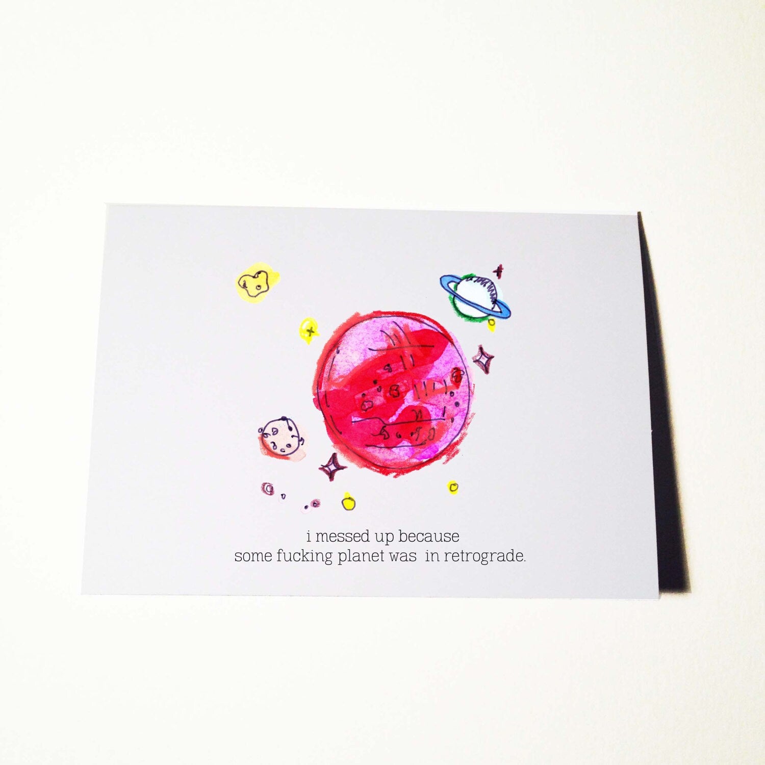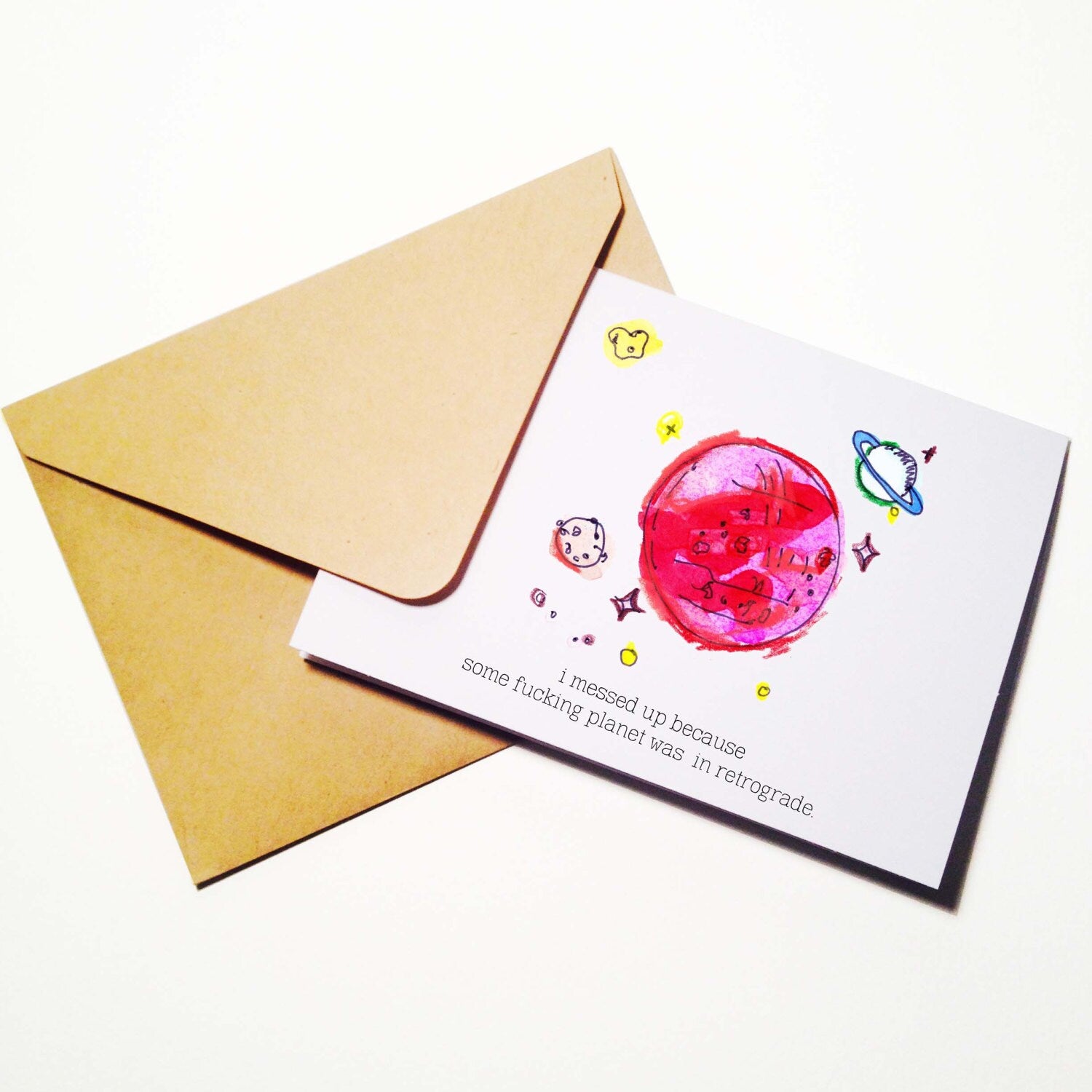 Let them know you are sorry for messing up. This card reads "I messed up because some fucking planet was in retrograde". Options for the inside of this card: 1. (default) Left blank for a personal message 2. Upon request "Sorry Again" can be added. 3. Any special request can be noted at check out Comes complete with a brown envelope.
