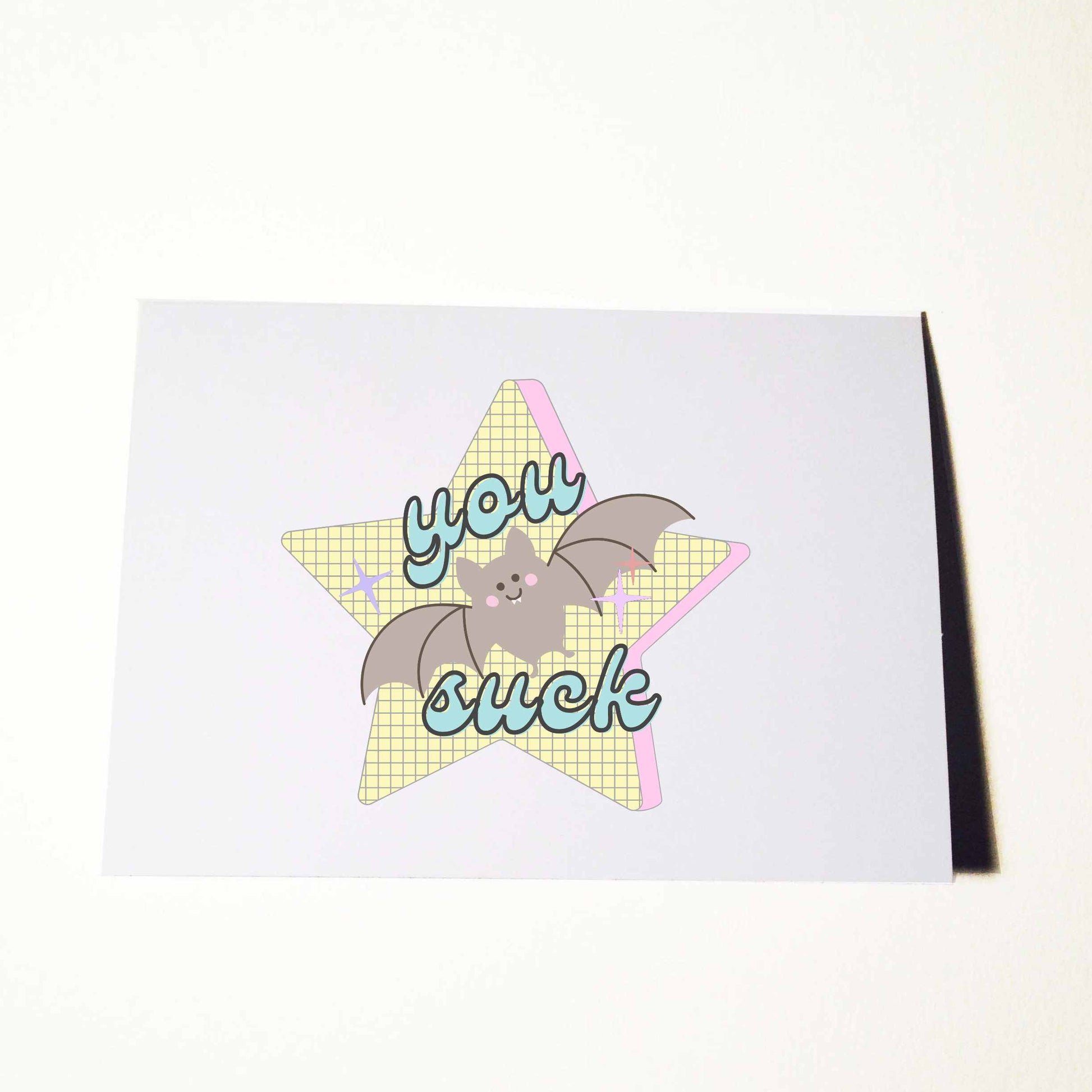 Hehehe! A vampire batty telling you what's up! Add a message to your favorite person. Left blank inside. Comes complete with an envelope.